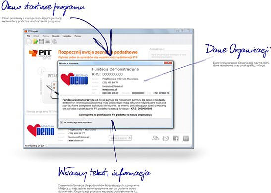 Jednym z ważniejszych obiektów programu PIT Projekt które można elastycznie dostosowywać jest tzw. "Okno startowe" (ekran powitalny). Pojawia się ono wraz z uruchomieniem programu i zawiera przeważnie podastawowe informacje o Państwa Organizacji takie jak: nazwa, krs, adres, telefony, fax, e-mail, adres www, logo oraz tekst powitalny typu: